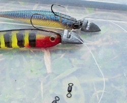 В качестве джиг-головок для софтджерков я применял Straight Jigheads от Illex, которые в течение многих лет приносили мне хорошие уловы. Особенно оживленной игрой они обязаны угловатой и заостренной спереди форме головки. Движение приманки с таковой джиг-головкой радует глаз. Это достаточно веская обстоятельство чтобы попытаться ловить на оснастку с двумя No-ActionShads на таковой джиг-головке. При проводке у самого берега игру, которую демонстрируют обе приманки, тяжело обрисовать словами. Время от времени они быстро расходятся более чем на 1 м друг от друга, а после этого снова соединяются. Простые круглые головки не смогут кроме того приближенно обеспечить подобную игру. Конечно, и уловы бывают отменными, потому, что чувство от быстро продвигающейся по воде стайки рыб не оставляет ни единичного окуня, ни свору окуней равнодушными.